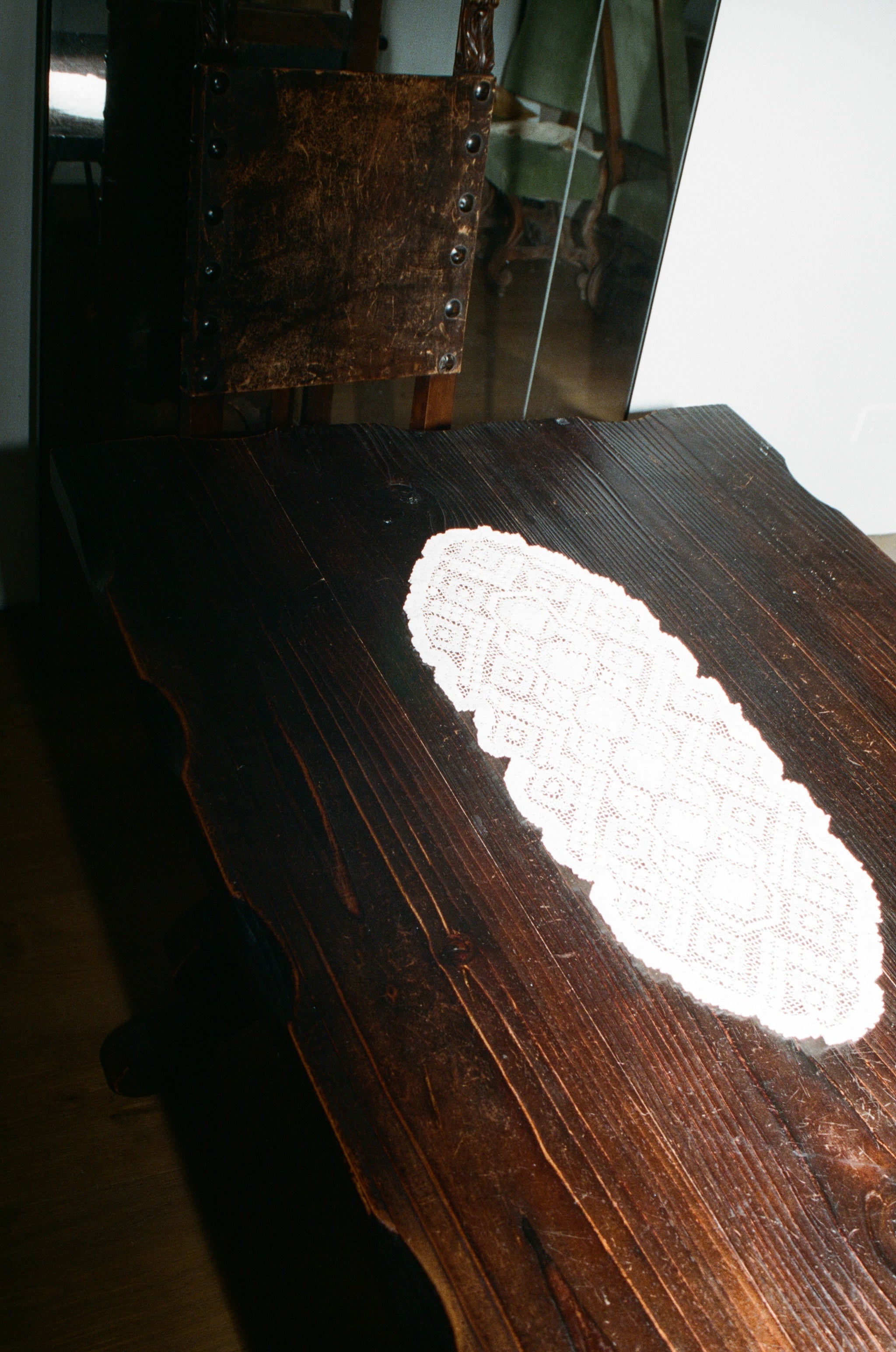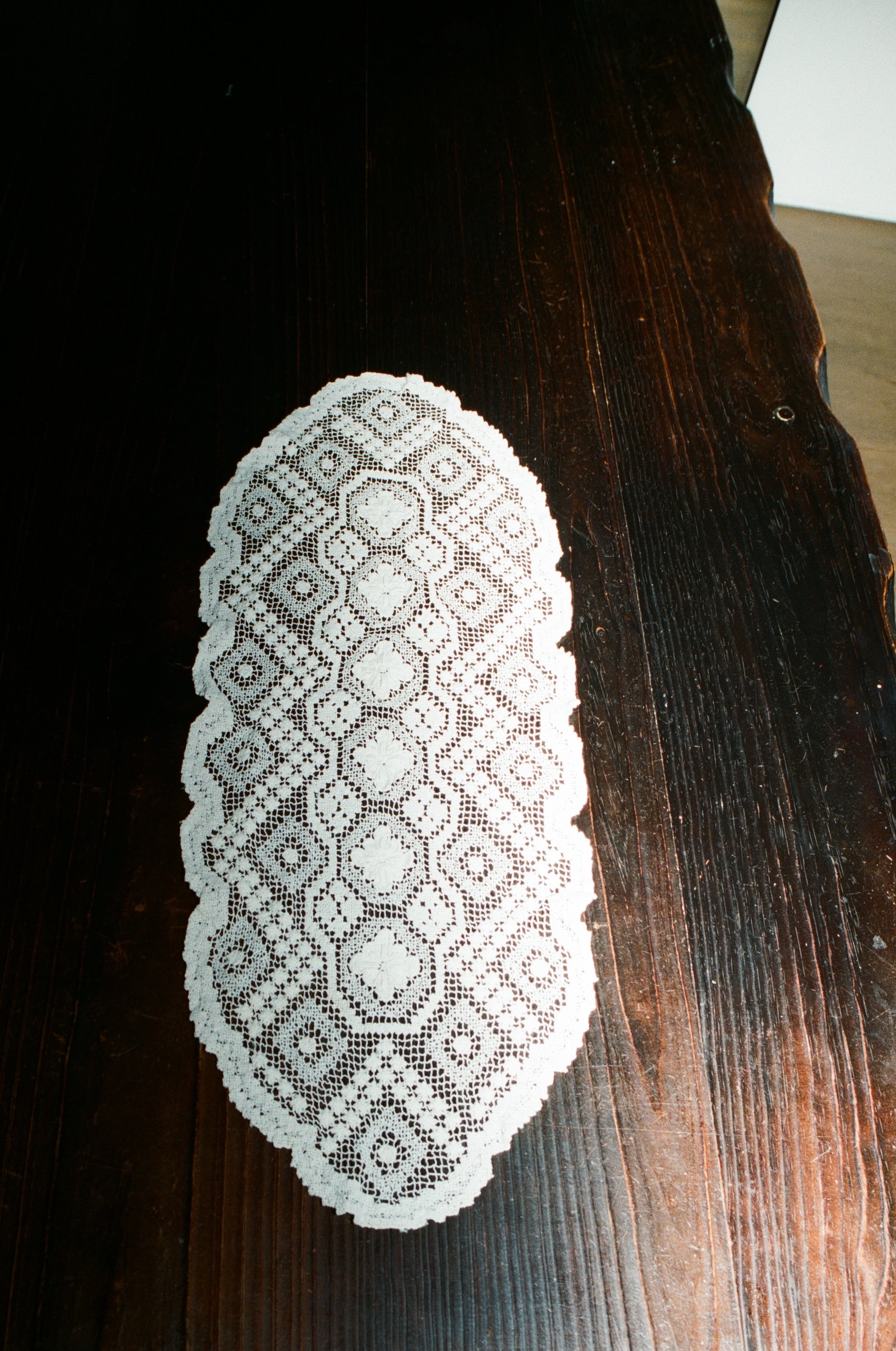 A beautifully detailed vintage crochet lace runner, showcasing geometric motifs with floral accents and a delicately scalloped edge. Its elongated oval shape makes it perfect for layering along a dining table, sideboard, or console, adding timeless texture and elegance.