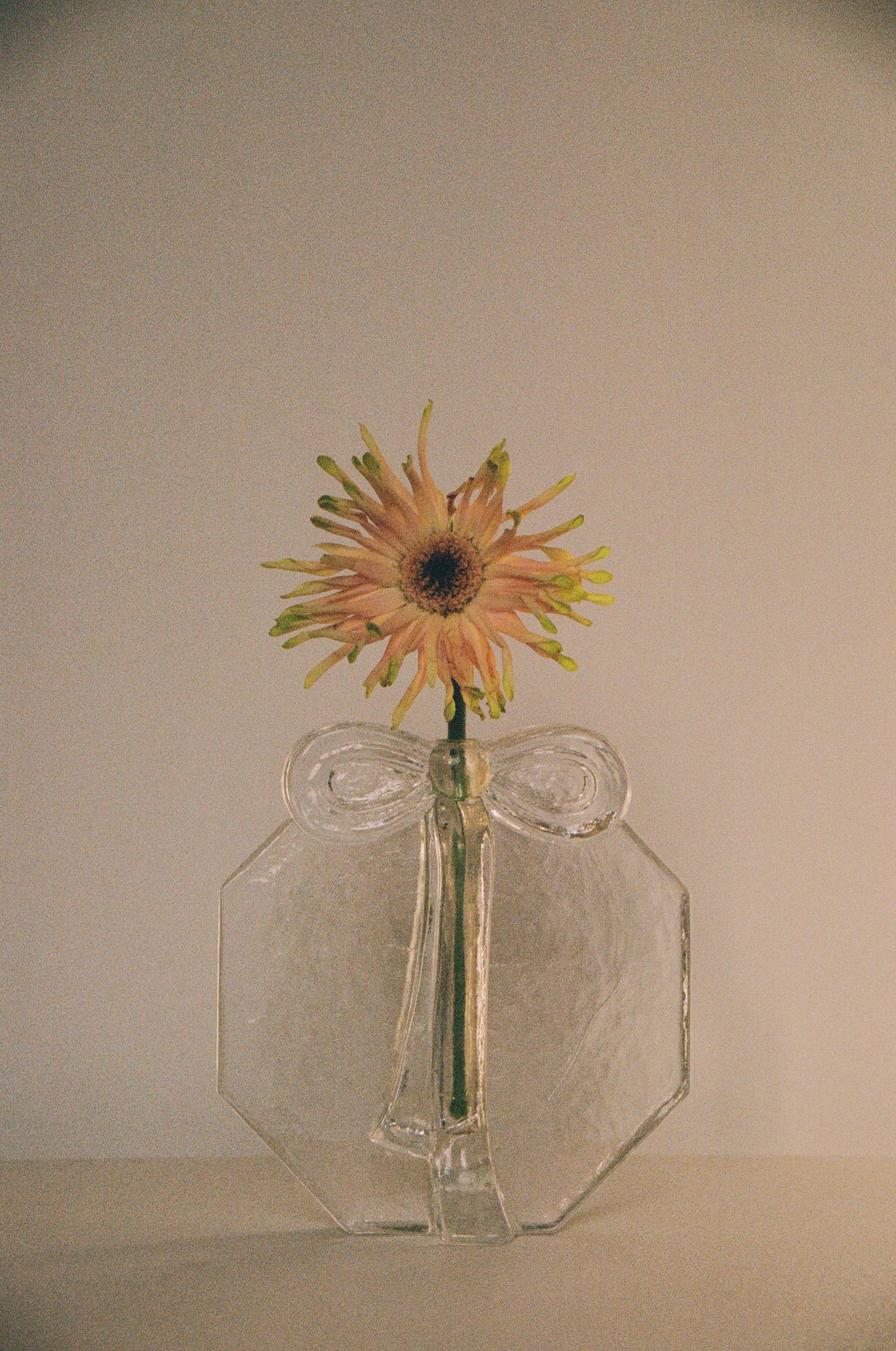 Elevate your floral arrangements with this charming glass bud vase from the 1960s, adorned with a delightful bow motif. Crafted with style and sophistication, this vase exudes elegance and grace, perfect for adding a touch of refinement to any space.