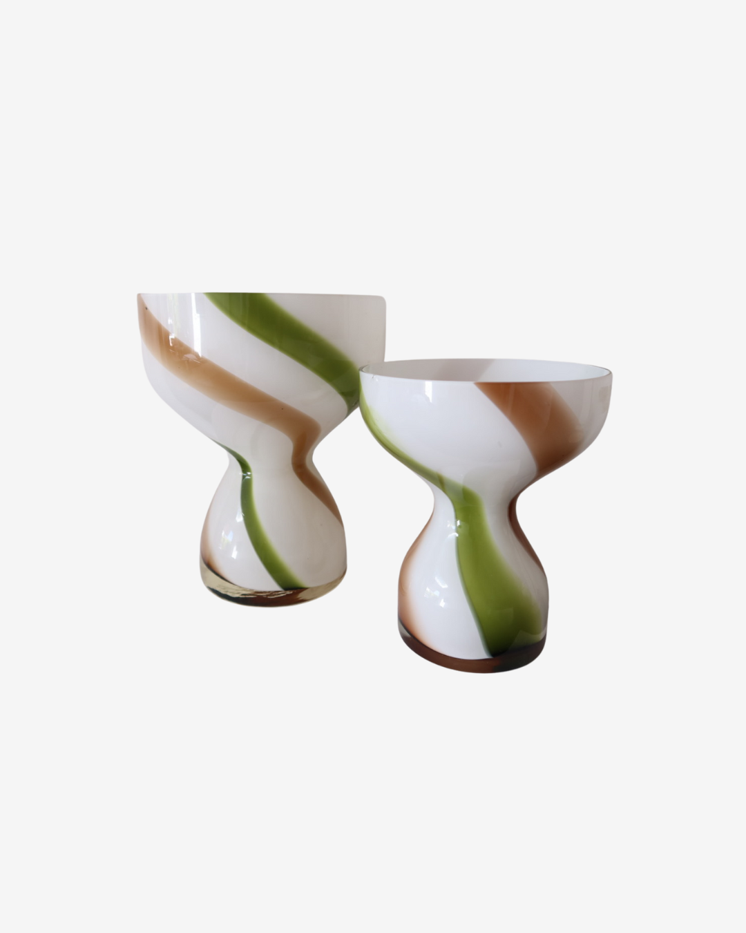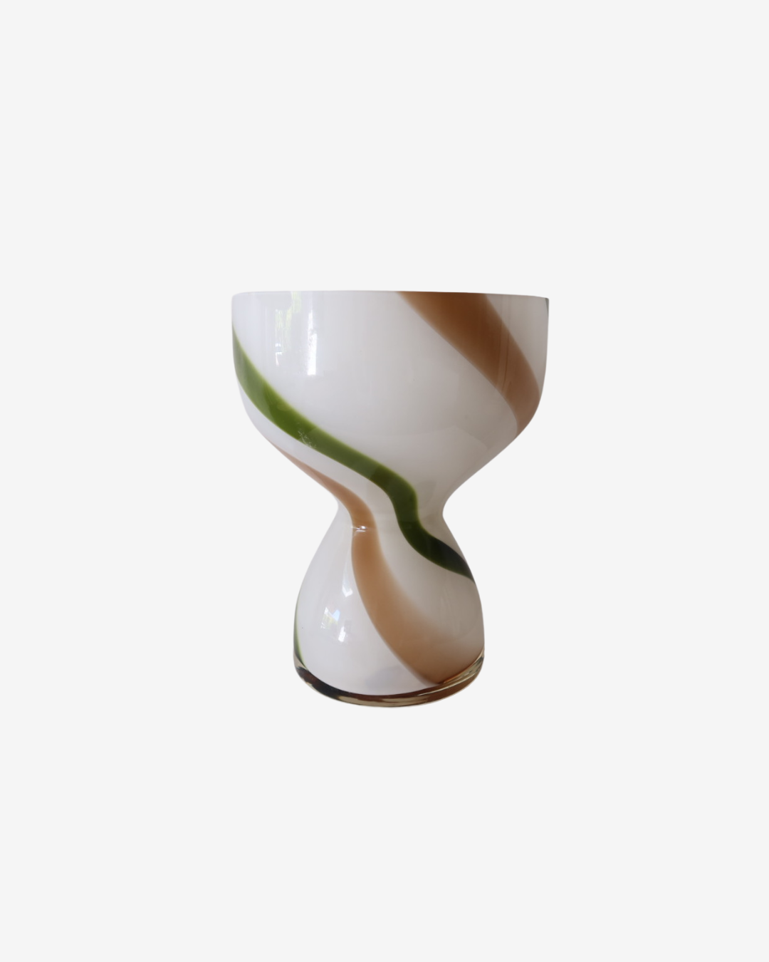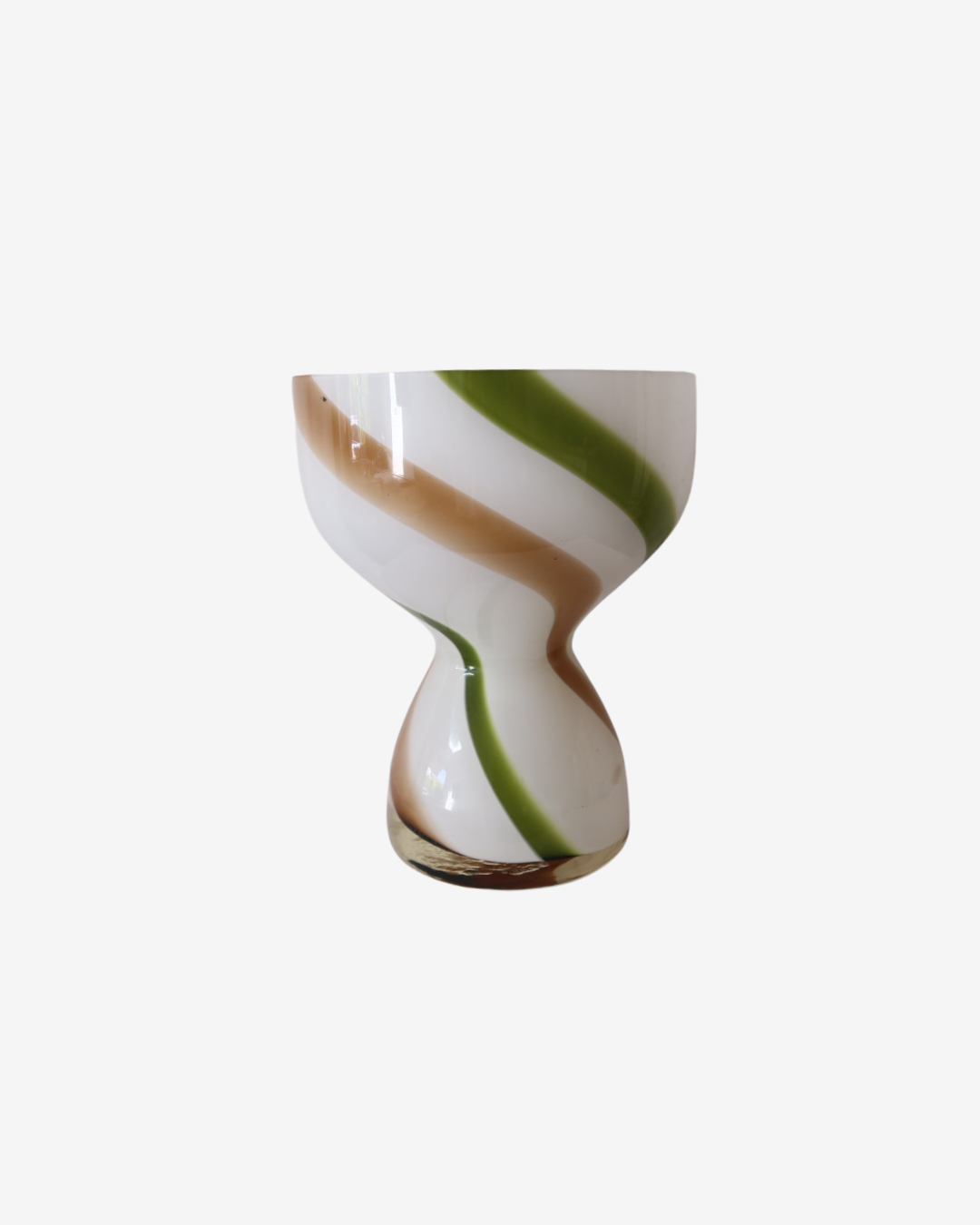 Fill it with flowers, or leave it empty—either way, this vintage glass vase is a true work of art that will instantly become a statement piece in any room. Its fluid, graceful shape captures the eye, while the subtle brown and green color details add depth and sophistication. The truncated conical base creates a striking contrast, grounding the vase with a modern touch that complements its timeless design. Whether it’s holding blooms or standing alone as a sculptural accent, this vase blends artistry and function beautifully, adding a unique charm to your home décor. Pair it with the Bianca Small vase for an extra wow!