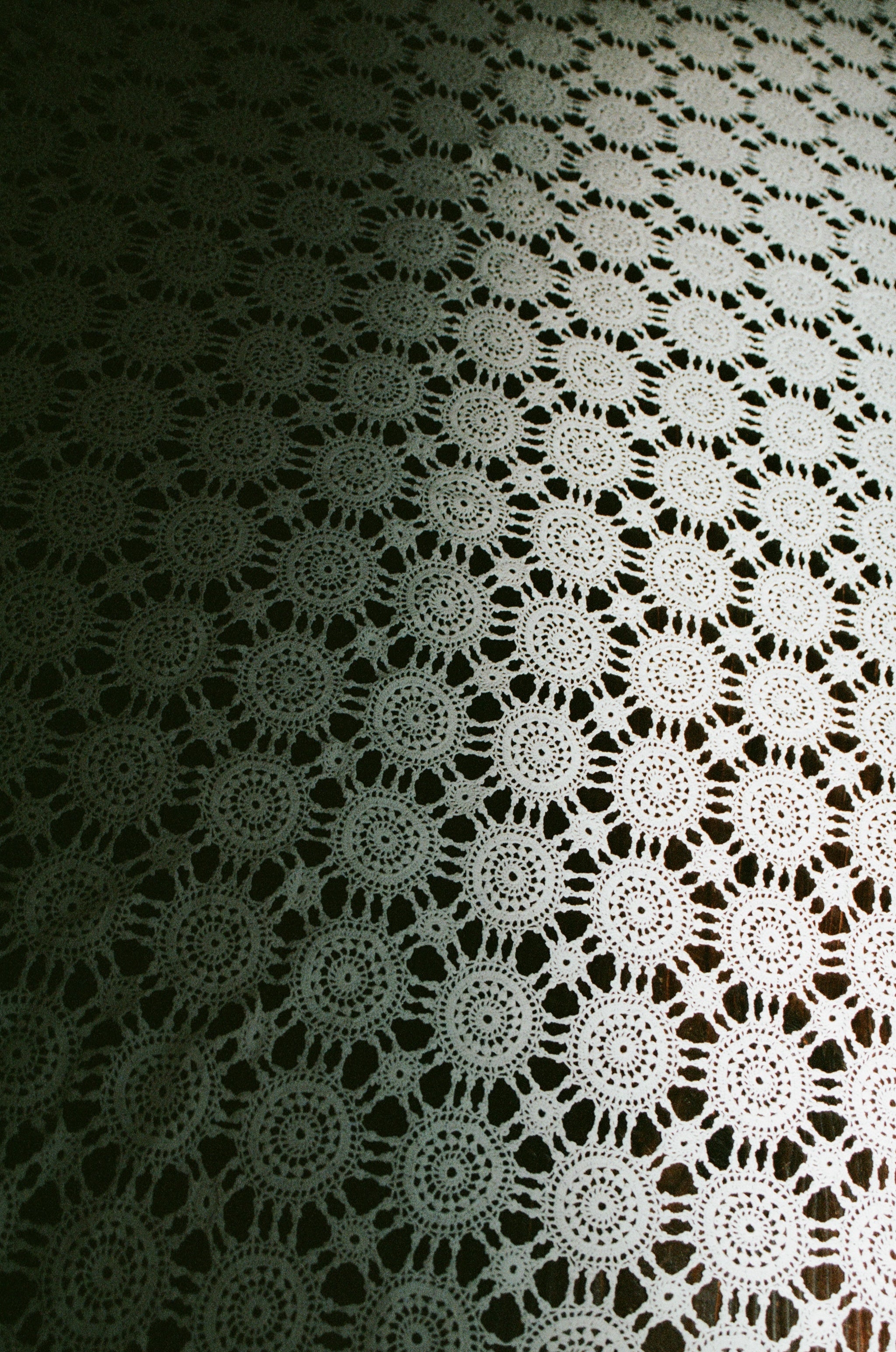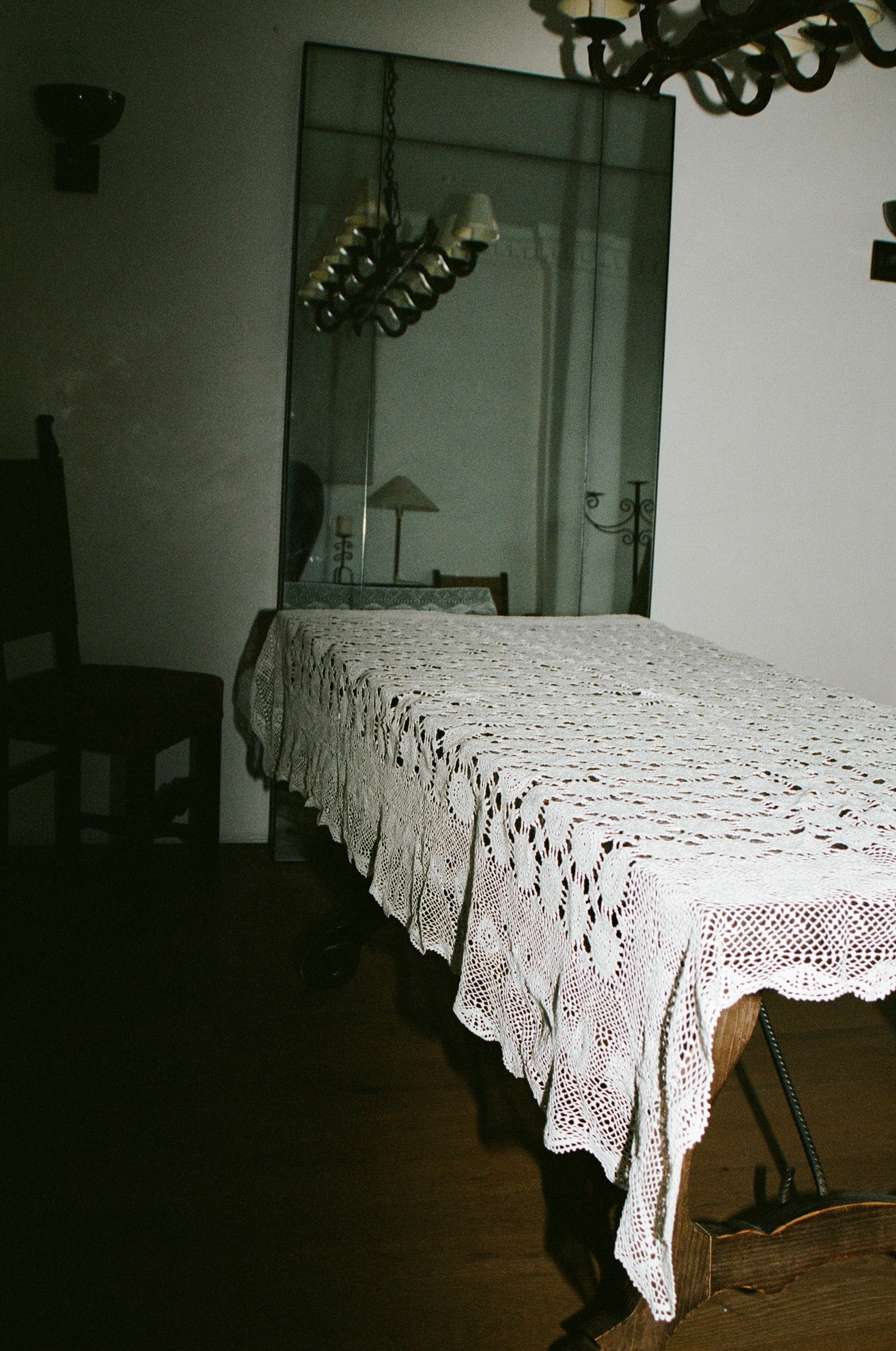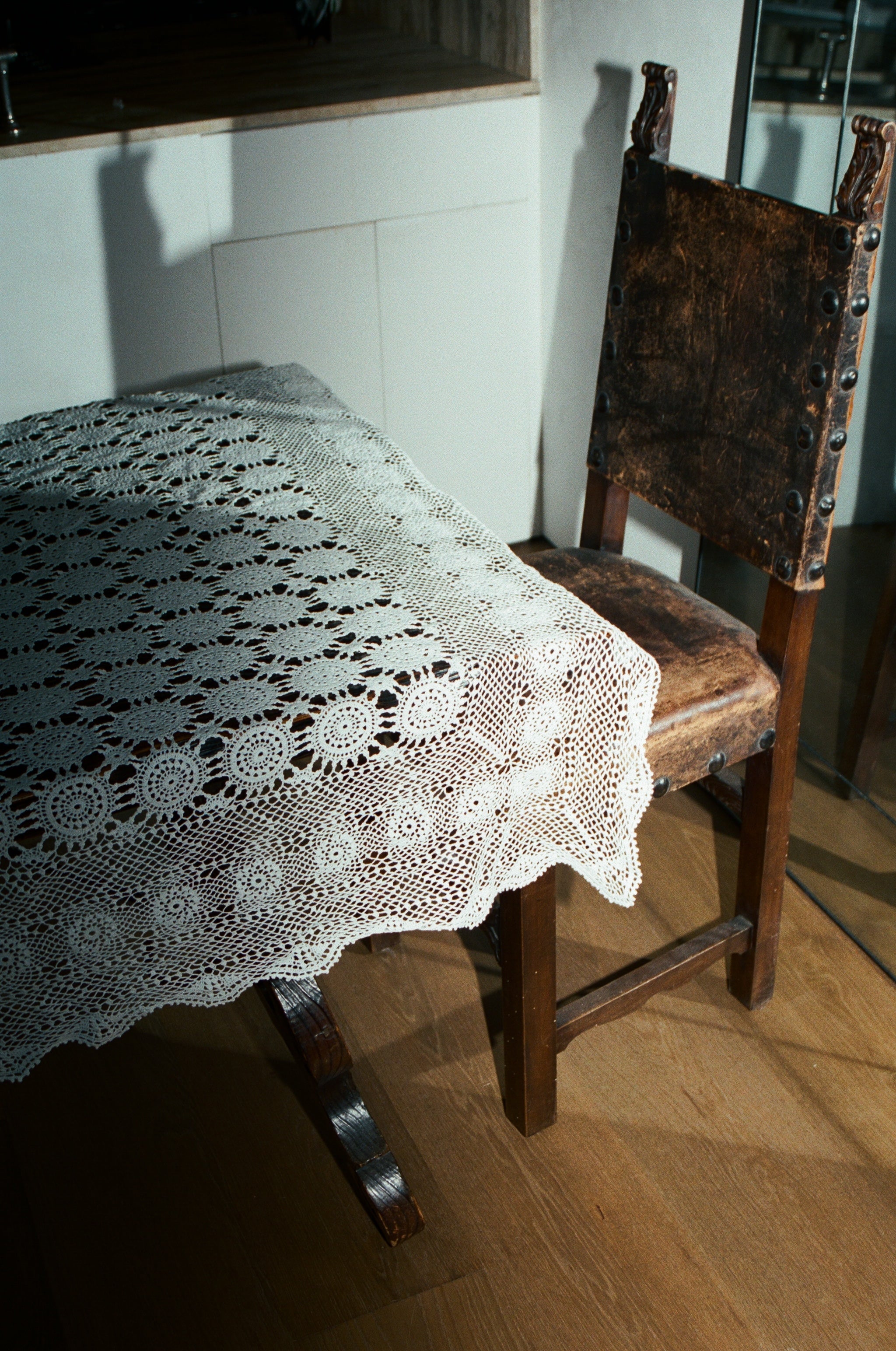 A beautifully hand-crocheted vintage lace tablecloth in a ecru tone, featuring delicate circular motifs and scalloped edging. Perfect for layering over timber or stone, styling an intimate dining table, or adding a touch of timeless craftsmanship to everyday use.