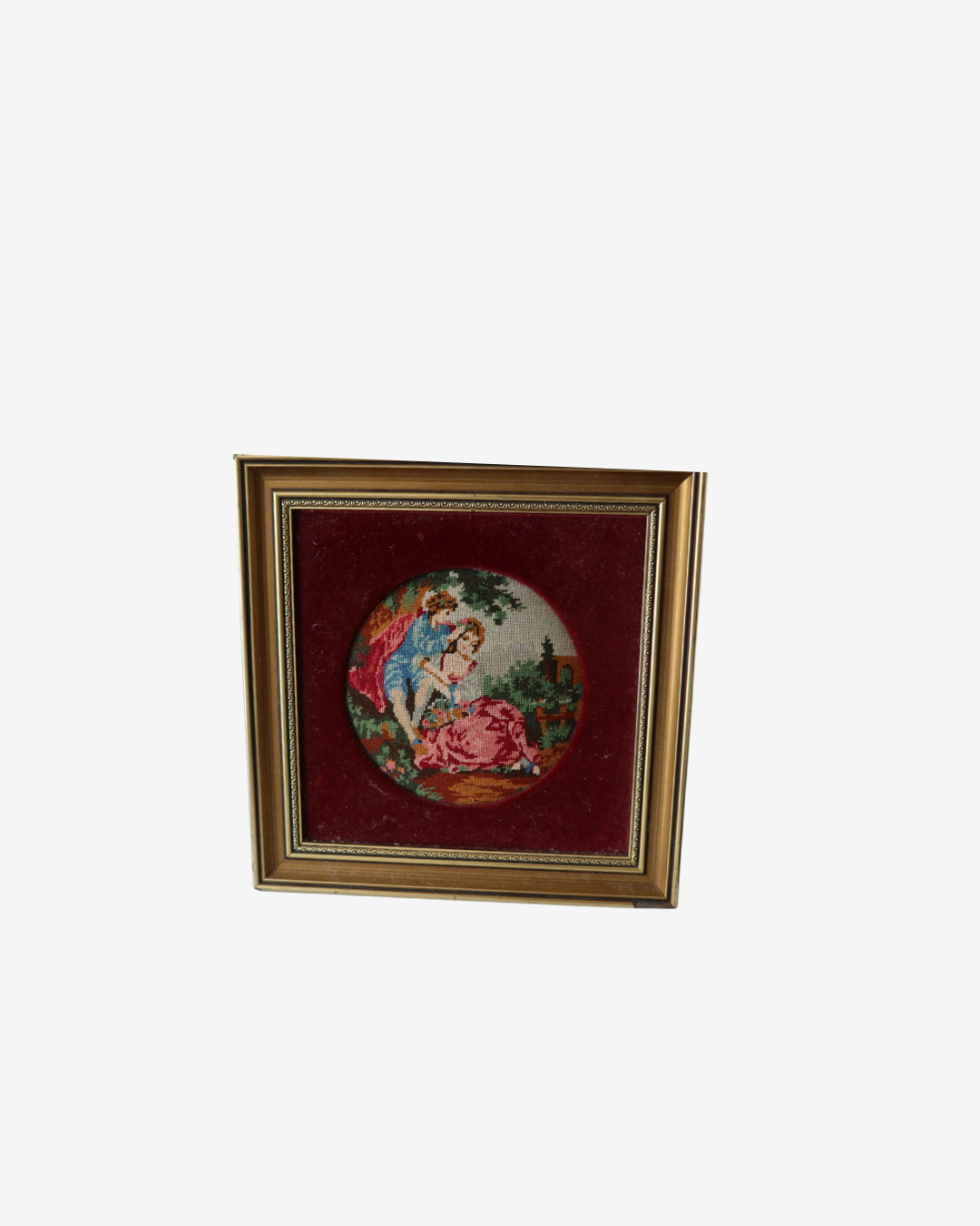 This small vintage Victorian needlepoint, featuring a romantic couple and floral countryside scene, captures the charm of the 1950s with its bright, vibrant colors. Perfect for hanging on a wall or displaying on a shelf, it adds a touch of nostalgia and romance to any space with its intricate craftsmanship and mid-century folk artistry.