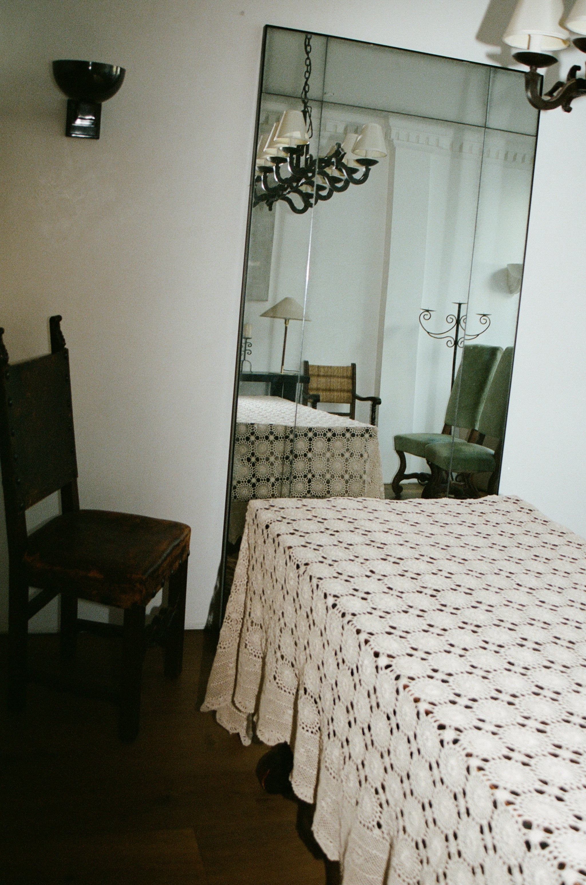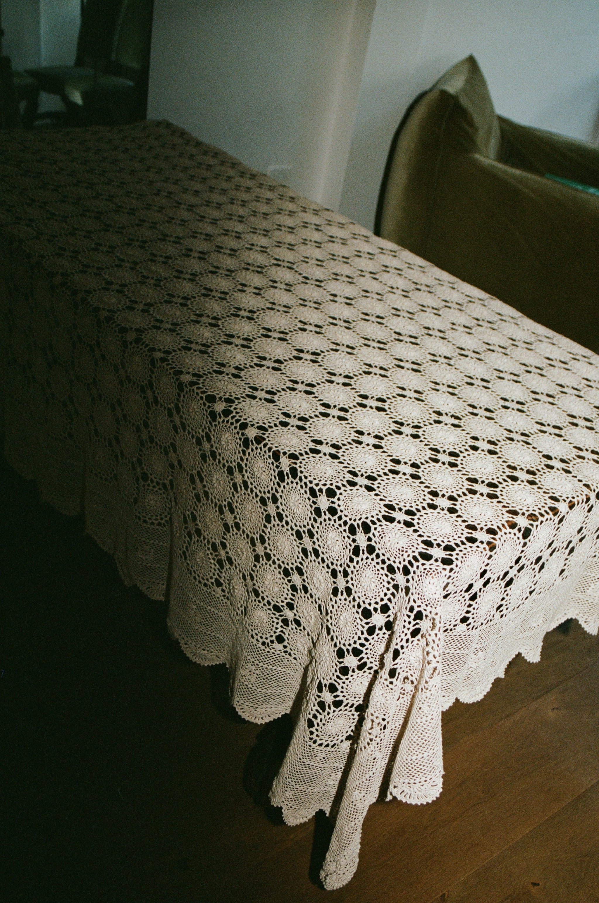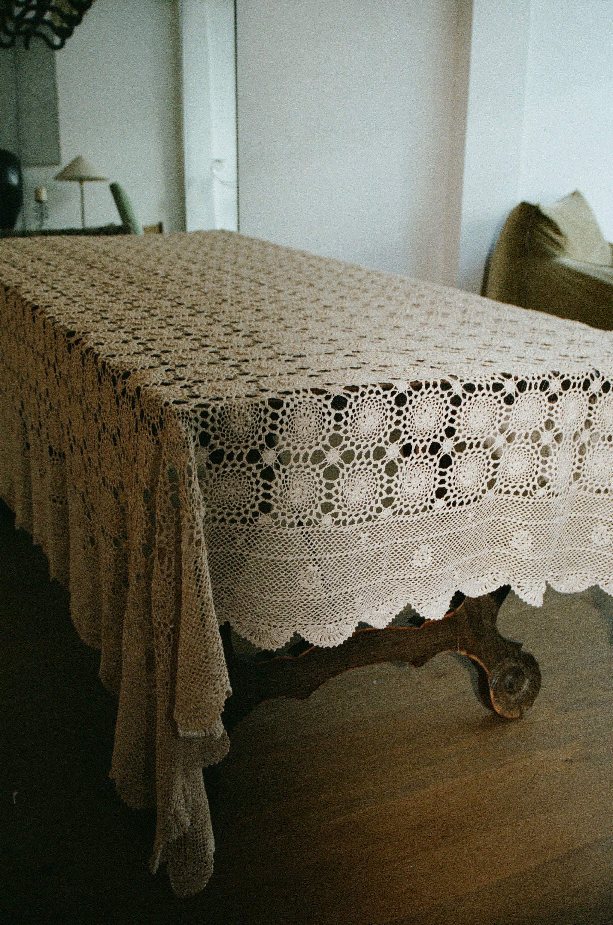 A hand-crocheted vintage lace banquet tablecloth in a soft ivory tone, featuring intricate detailing and a generous size perfect for long tables or layered styling. A timeless piece that adds texture and elegance to both everyday dining and special occasions.