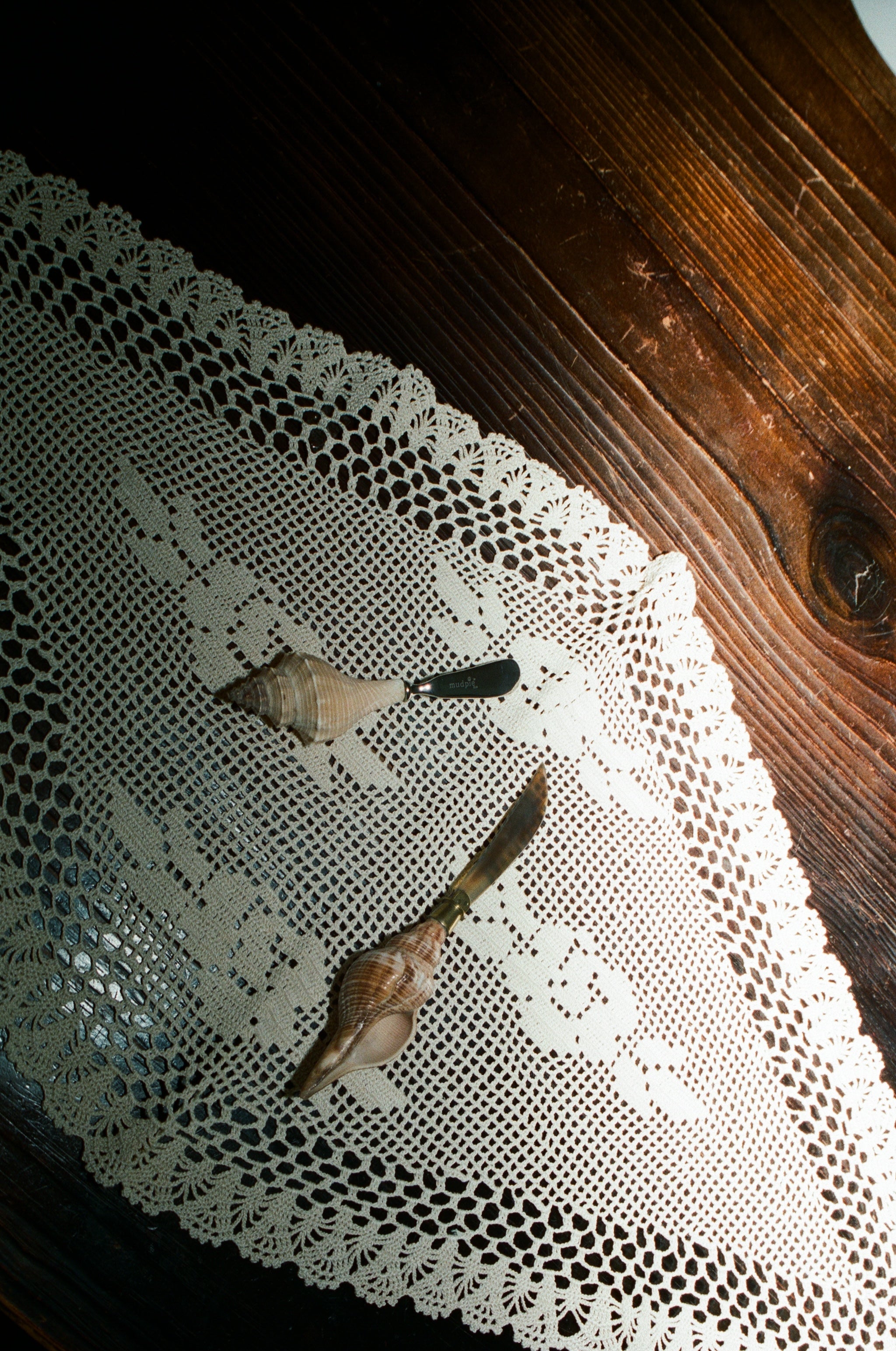 A unique vintage cheese knife featuring a natural seashell handle and horn blade, finished with brass detailing. A coastal-inspired piece that brings character and charm to cheese boards and long lunches.