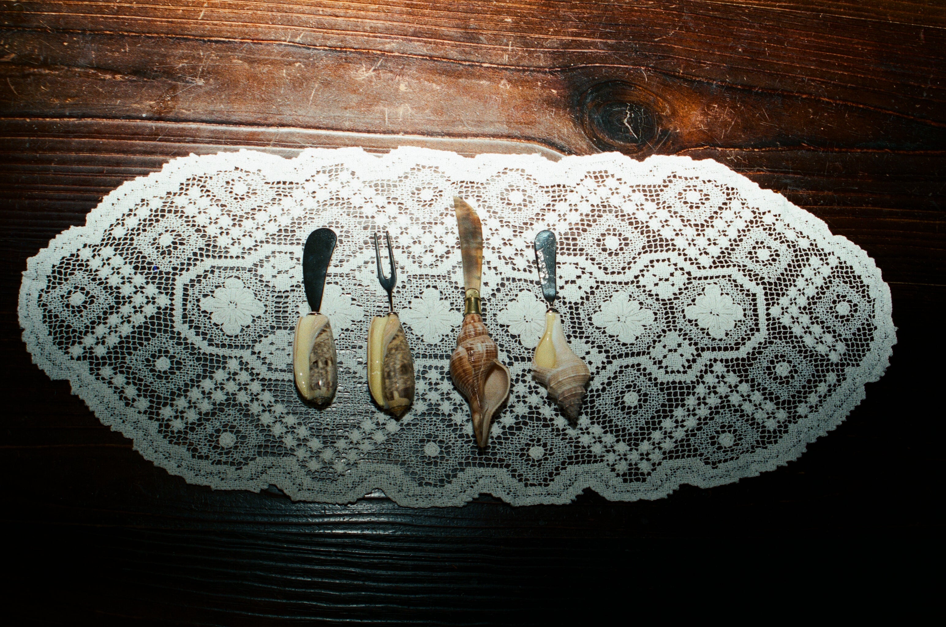 A coastal-inspired vintage cheese set, featuring a knife and fork with natural seashell handles and stainless steel blades. A rare and playful pair, perfect for entertaining, long lunches, and adding character to your table.